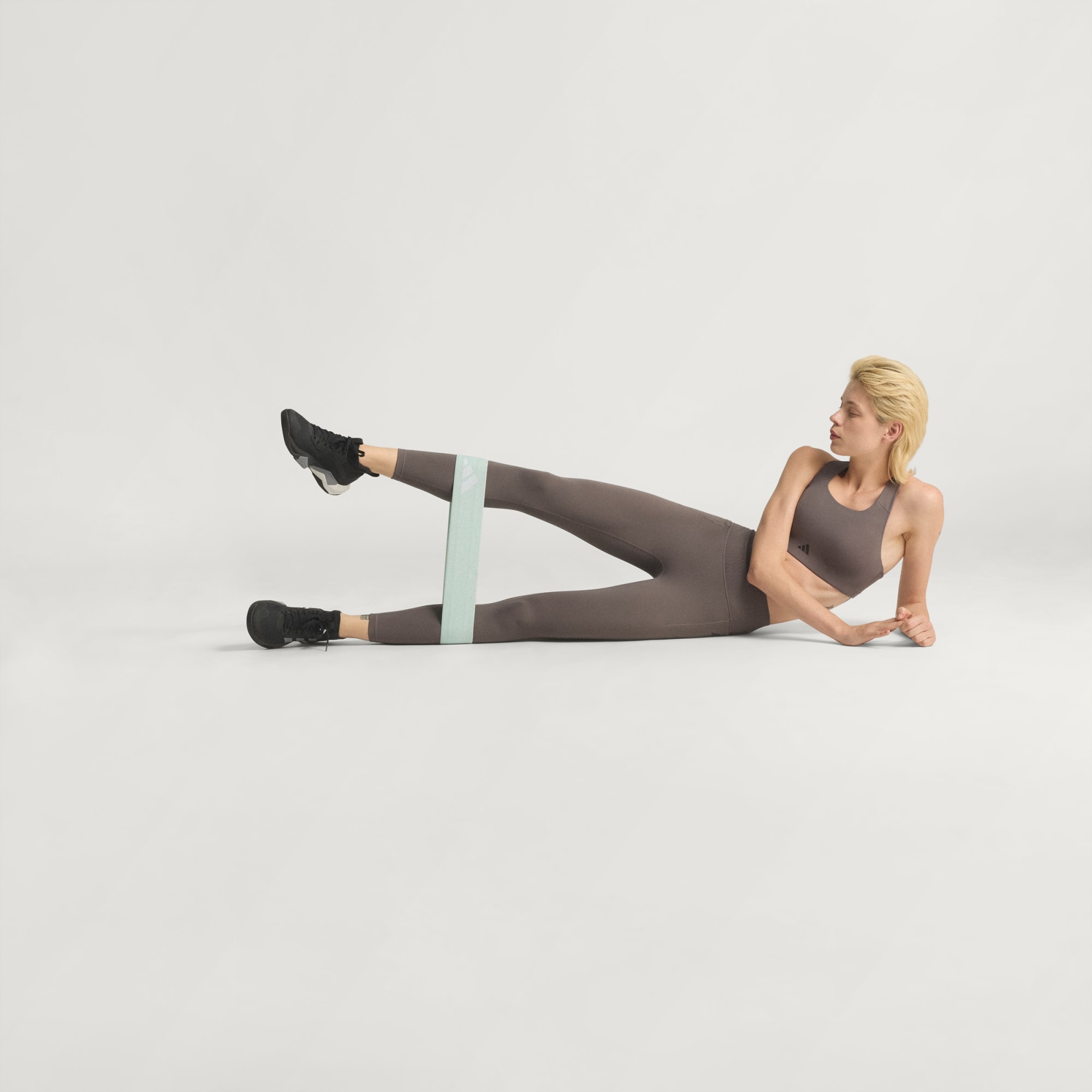 The image shows a person wearing gray athletic leggings with the Adidas logo visible, standing against a plain background.