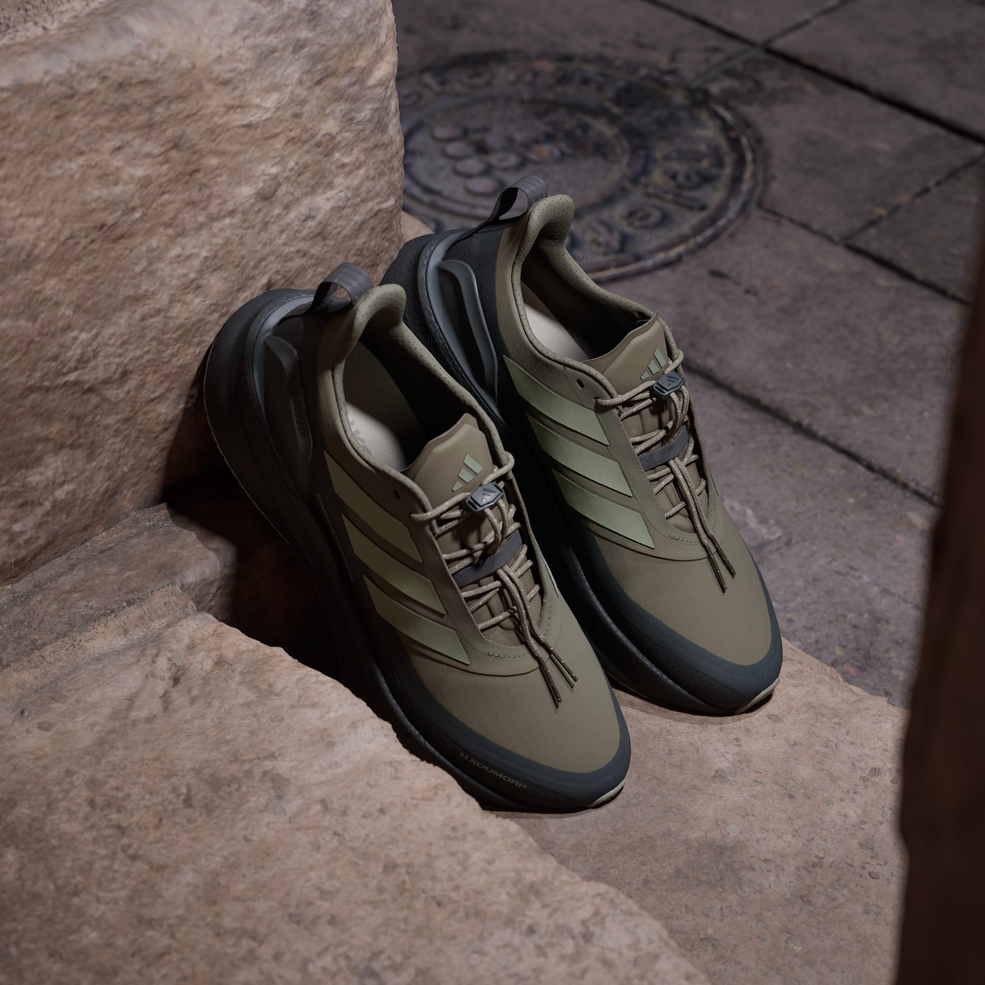 Series of images of the adidas x Hermanos Koumori collection, showcasing footwear and apparel for men.