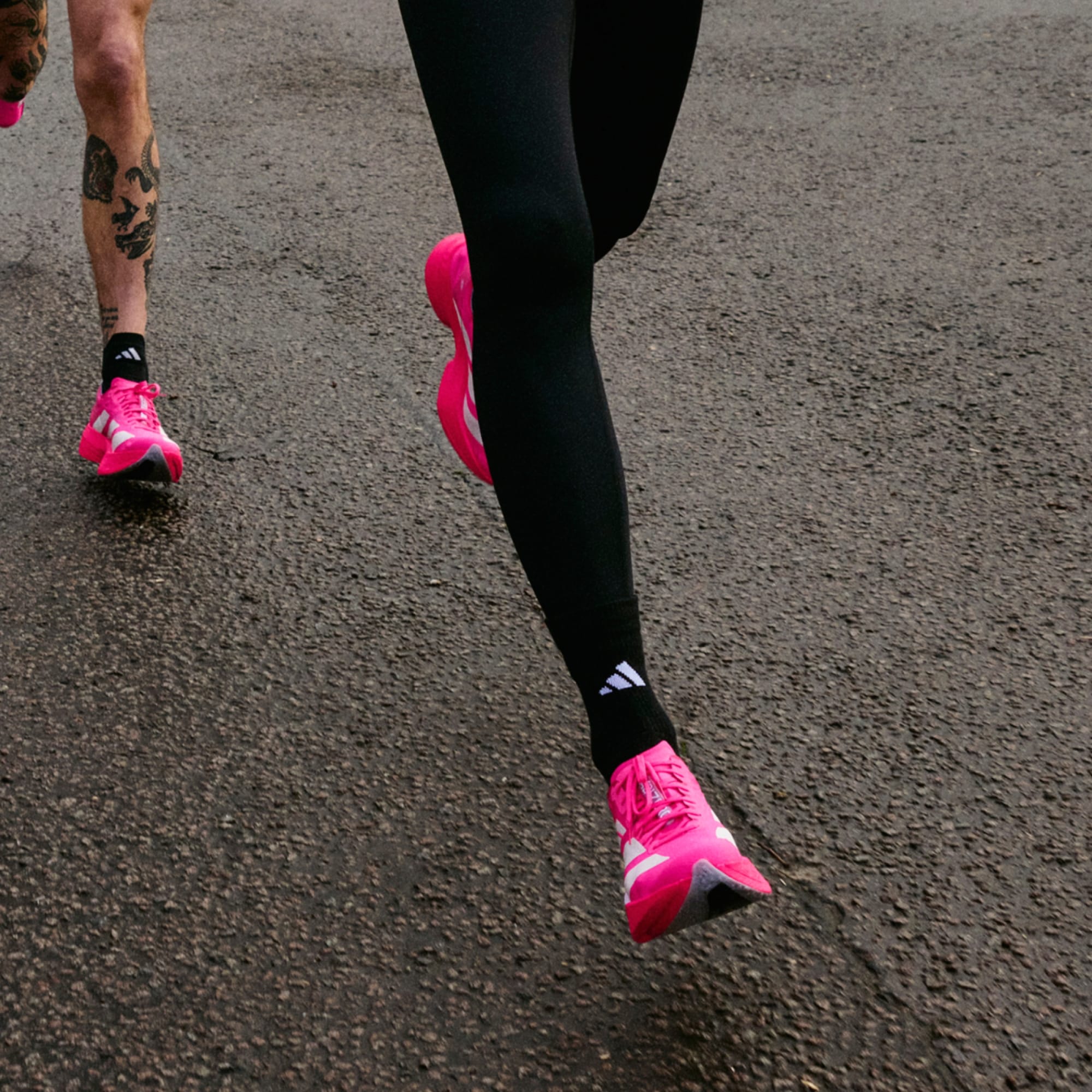 Elite athlete running a city marathon wearing adidas running clothing and Pro 4 shoes.