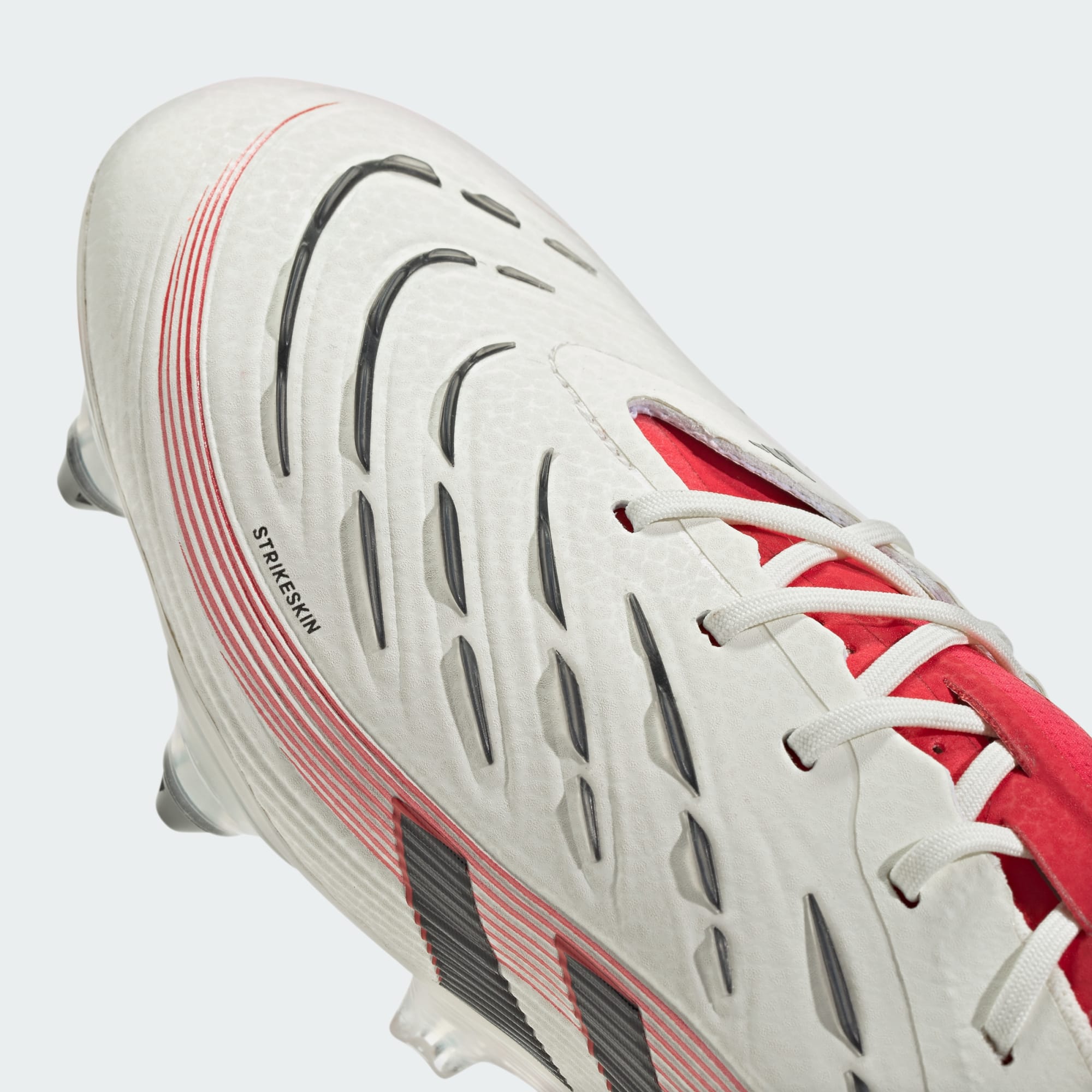 Μια λευκή και κόκκινη ποδοσφαιρική τάπα με το λογότυπο "Predator" εμφανίζεται σε σκούρο φόντο, χαρίζοντας κομψό και μοντέρνο στιλ.