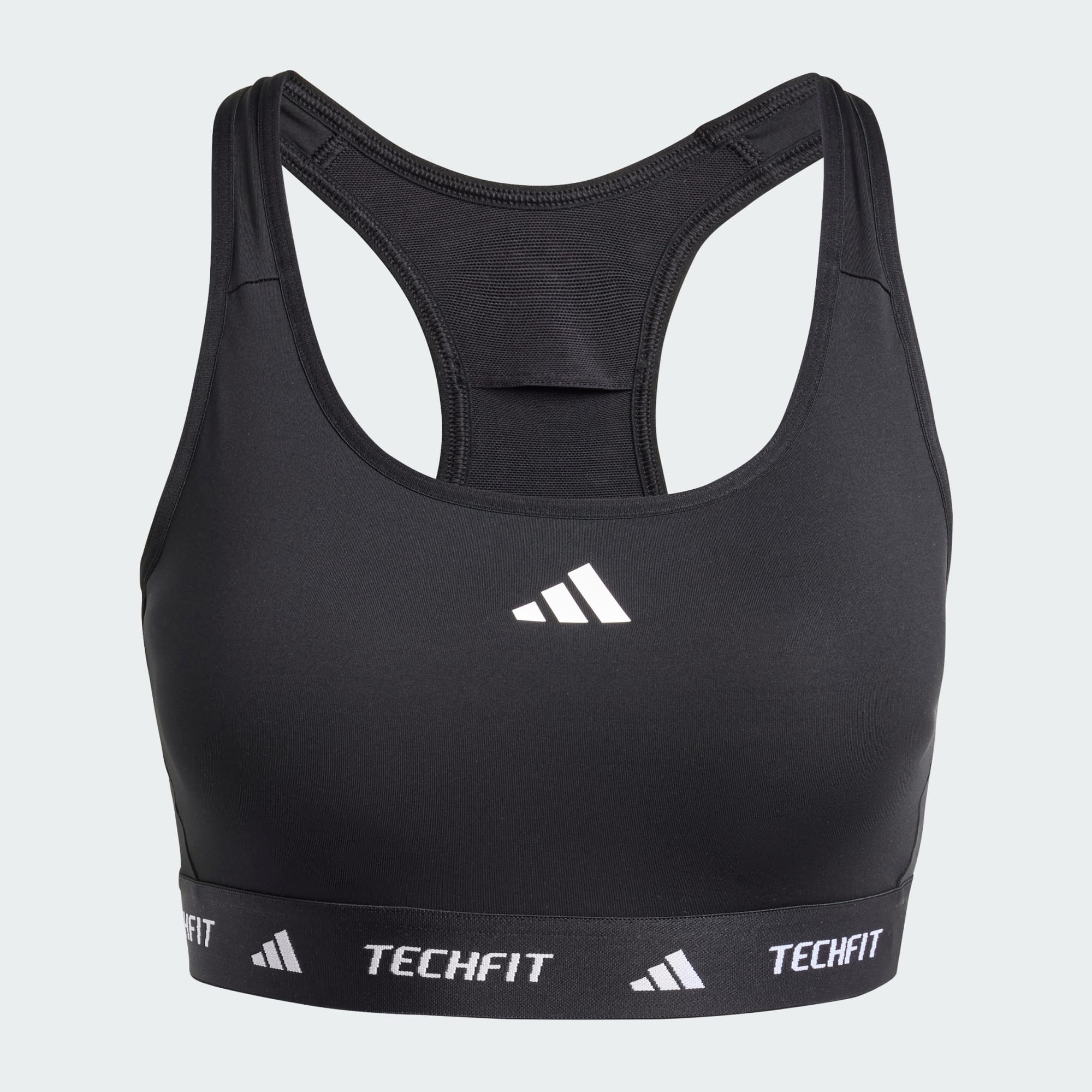 Η εικόνα δείχνει το μεσαίο τμήμα ενός ατόμου που φοράει αθλητικά ρούχα adidas Techfit, συμπεριλαμβανομένης μιας μαύρης μέσης με το λογότυπο Techfit ορατό.