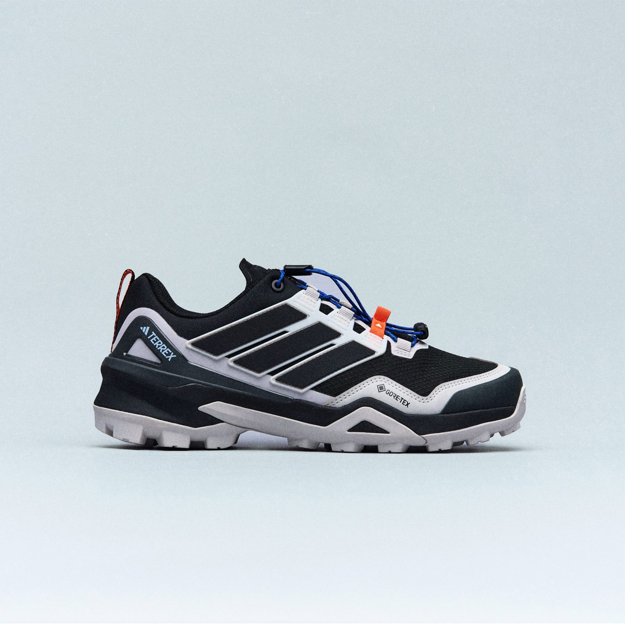 Κοντινή άποψη ενός ασπρόμαυρου αθλητικού παπουτσιού με το λογότυπο Terrex να εμφανίζεται σε ένα πορτοκαλί φόντο.